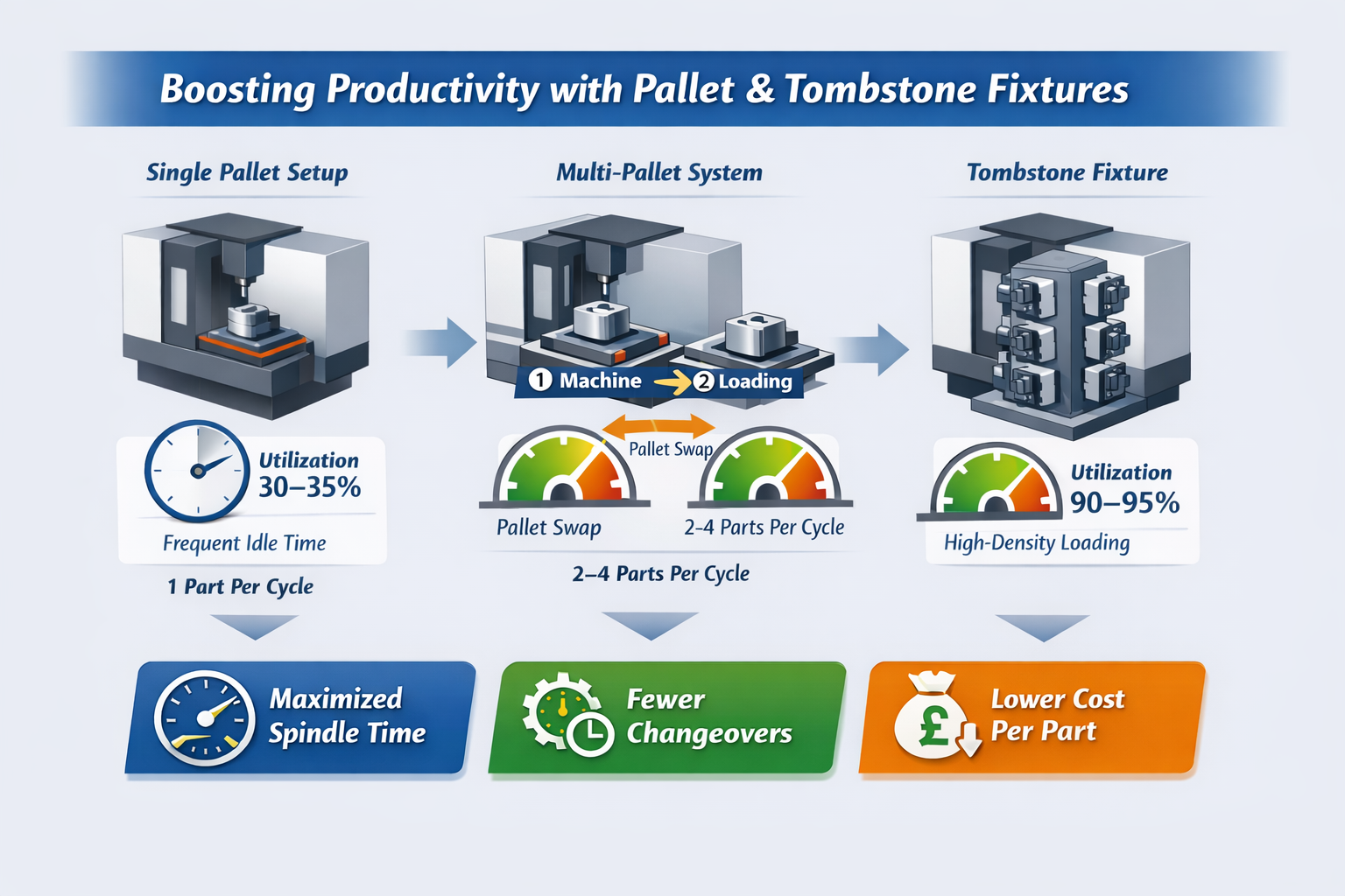 Traditional single-pallet machines often run at 20–30% utilisation, largely limited by downtime for loading, unloading, and setups. Multi-pallet systems overcome these bottlenecks: