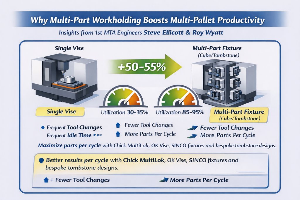 At 1st MTA, our engineers Steve Ellicott (Technical Sales Manager) and Roy Wyatt (Technical Manager) have extensive experience helping manufacturers get the most from their multi-pallet systems. This article explores why spindle utilisation gains of 85–95% are achievable, and why multi-part workholding and smart fixture design are often the difference between theoretical and real-world productivity.